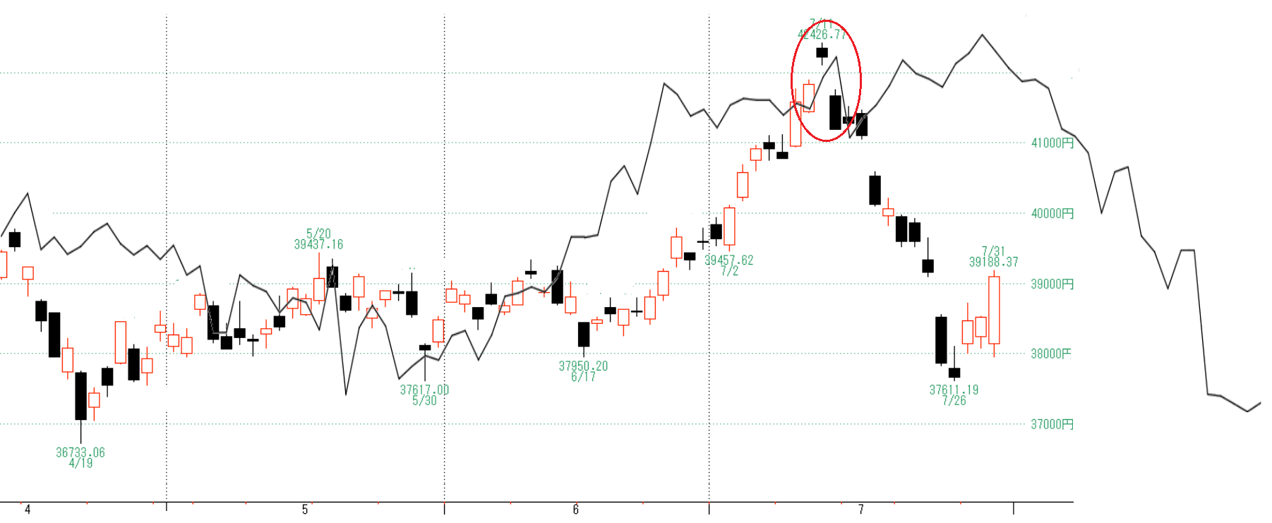 赤丸の日は変化日を高値で迎えたため下落となりました。