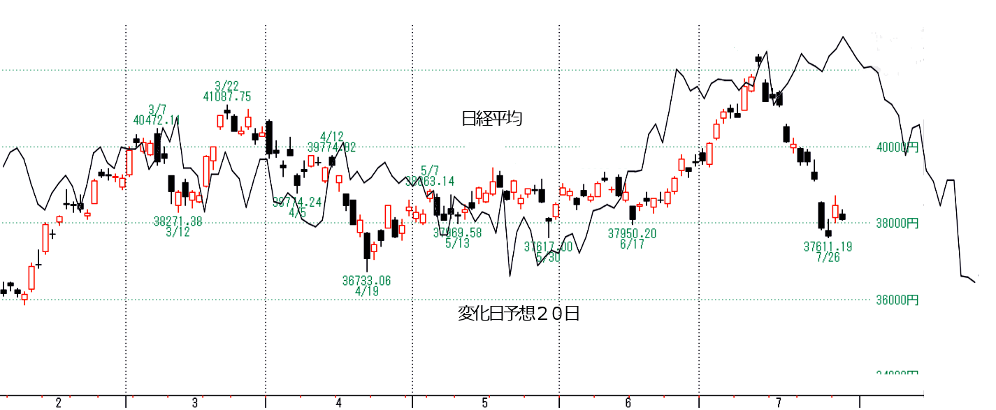 日経平均の20日先までの変化日予想です。この手法は前回7月16日に取上げました。その時「目先調整の場合は29日前後買い」と予想しました。結果29日前日の26日まで調整。そして29,30,31日と上昇。ここまでは予想通りの動きです。さて今後です。